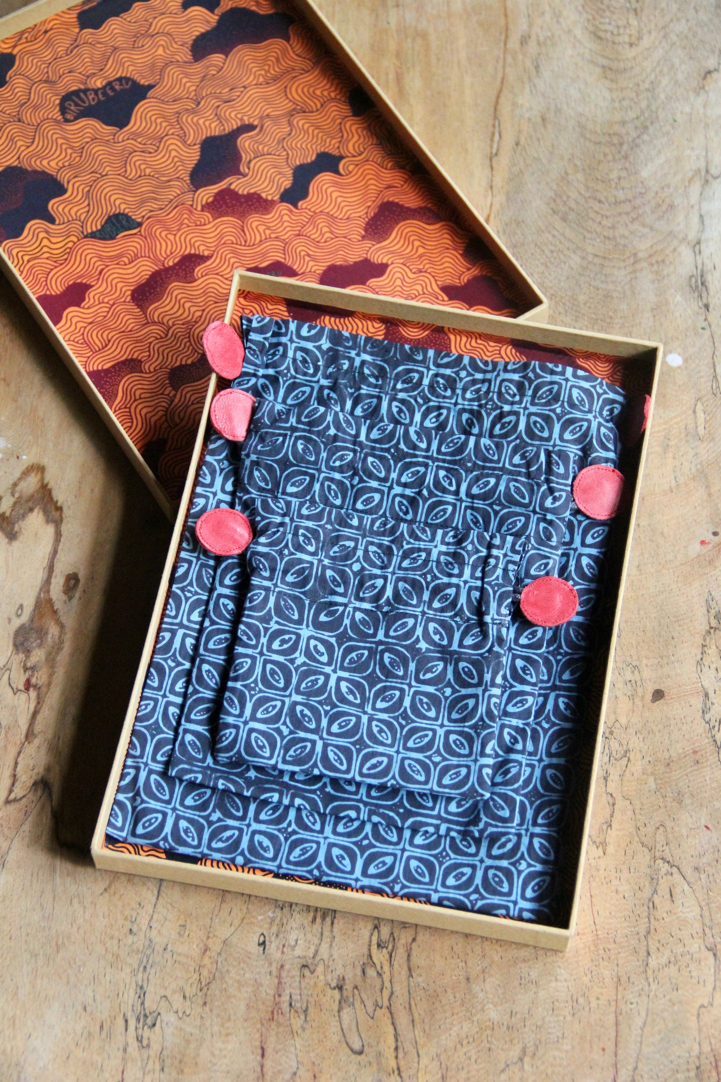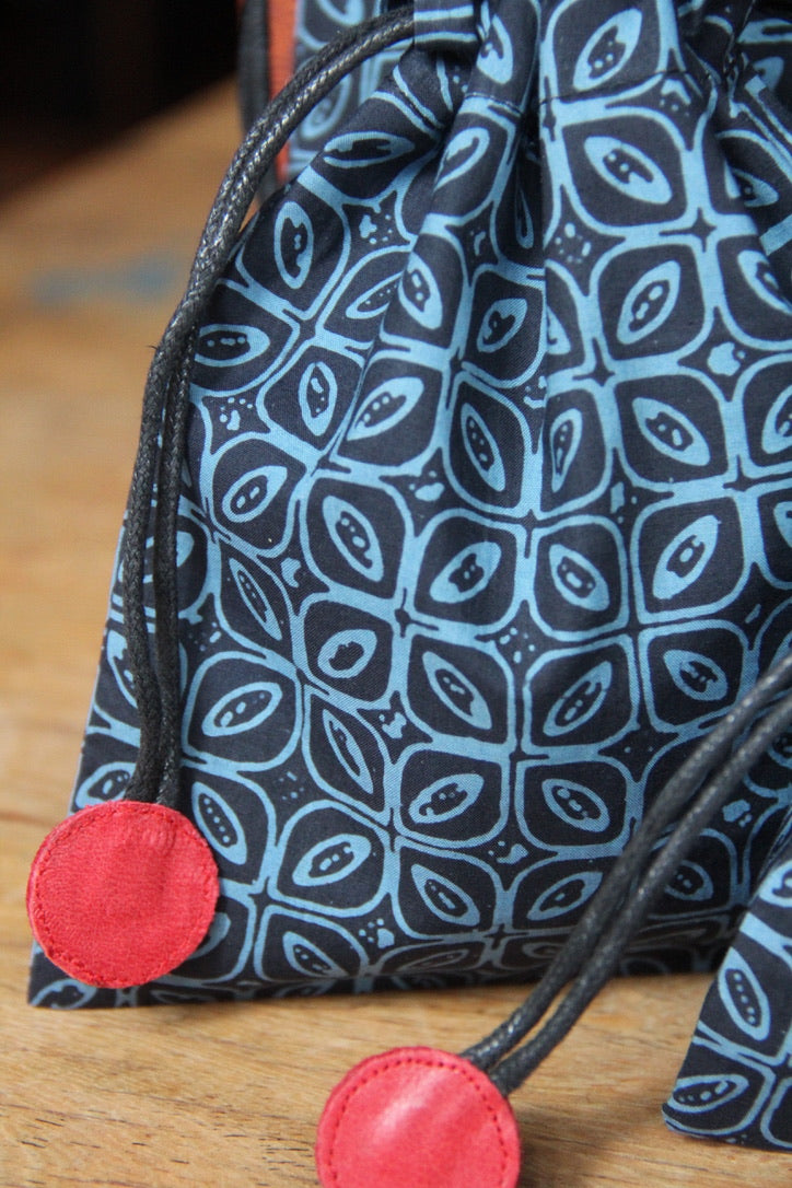 Each pouch is handcrafted using batik fabric, making every piece subtly unique. The interior is finished with a waterproof lining for everyday practicality, while red leather drawstring ends add a distinctive handcrafted touch.
