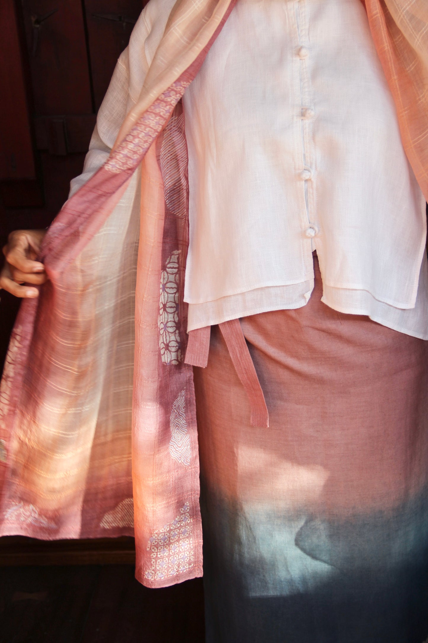 Hand wash gently in cold water with mild soap. After rinsing, let the garment breathe in the shade—keep it away from harsh sunlight, which may fade its natural beauty. In the beginning, wash separately, as the colors may softly run, like a memory letting go.