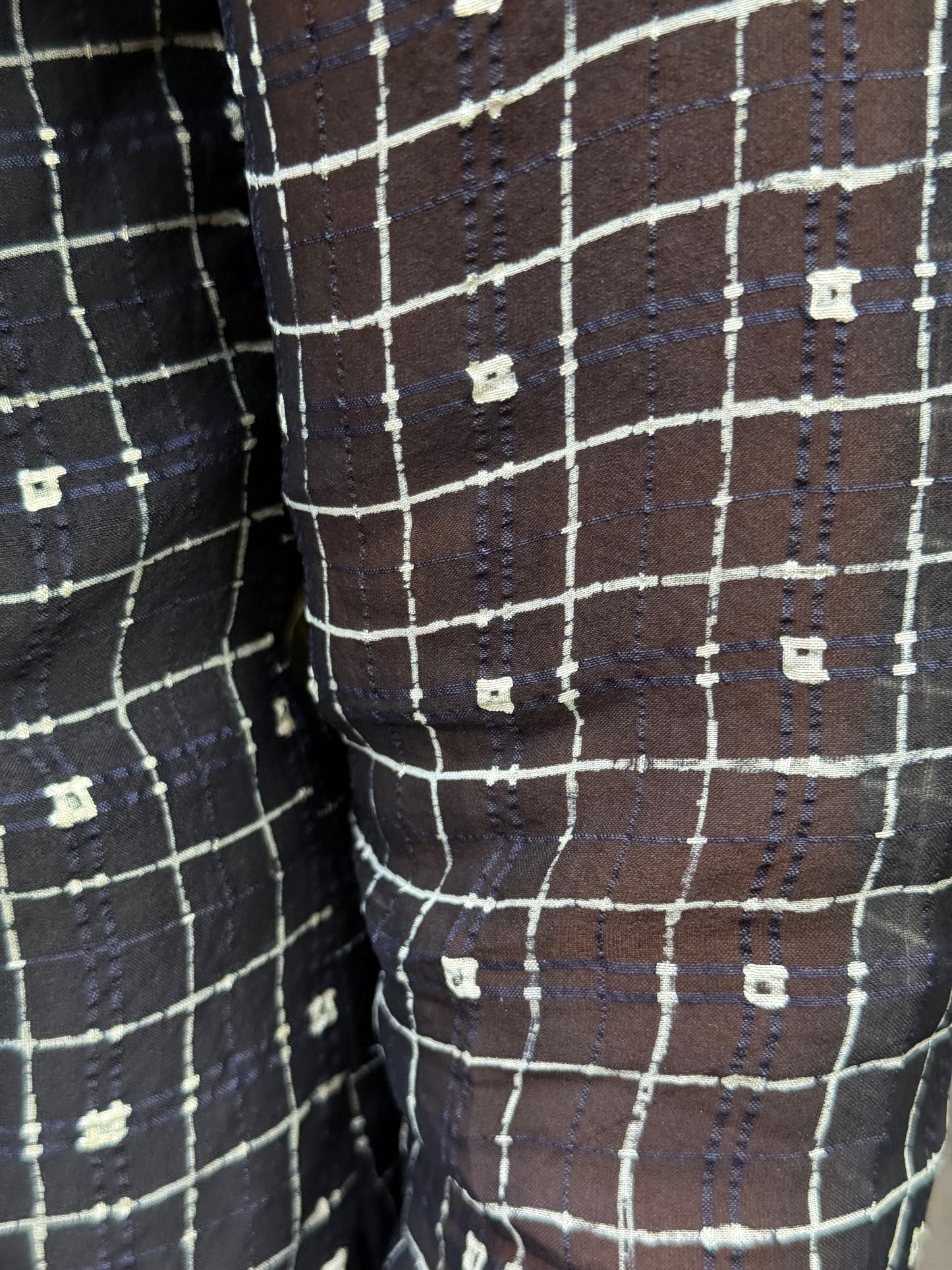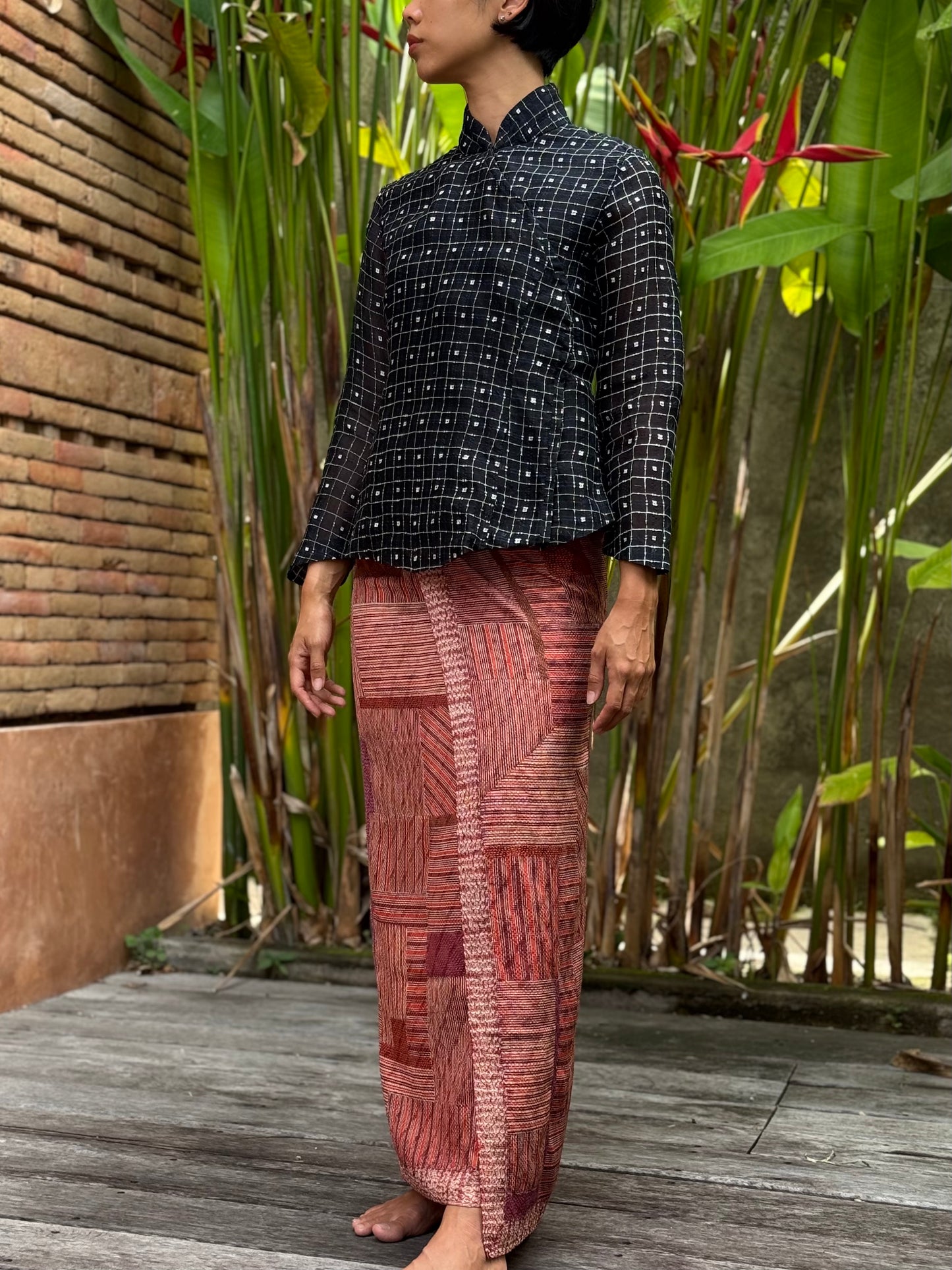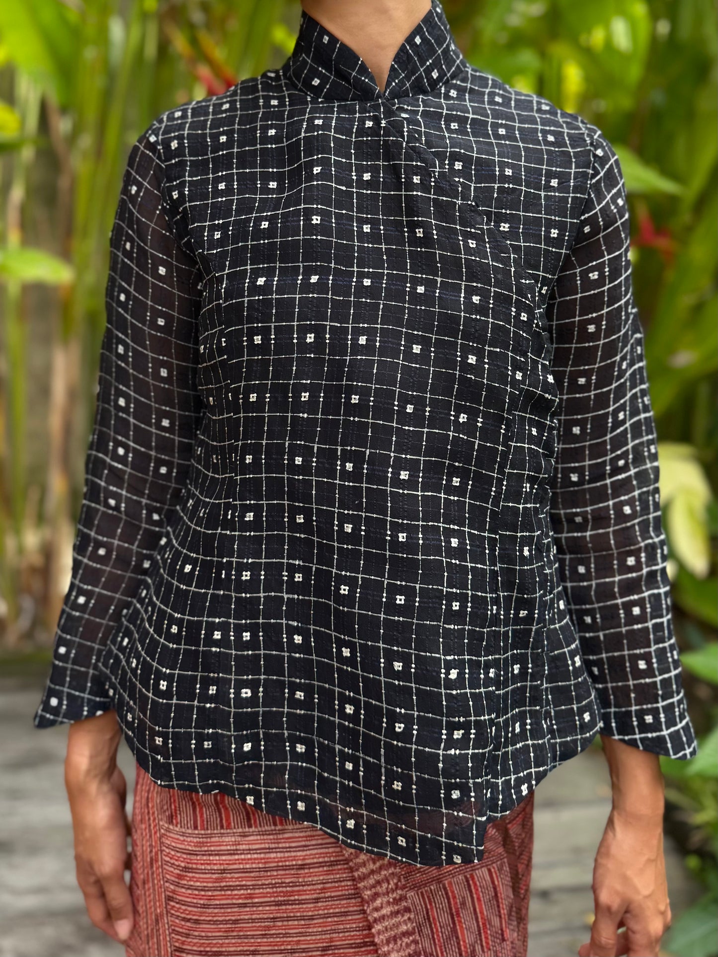 Drawn by hand, line by careful line. Raw silk gives it a natural structure — slightly stiff, beautifully textured, and unmistakably made by a person. A quiet motif, a mandarin collar, and nothing extra.