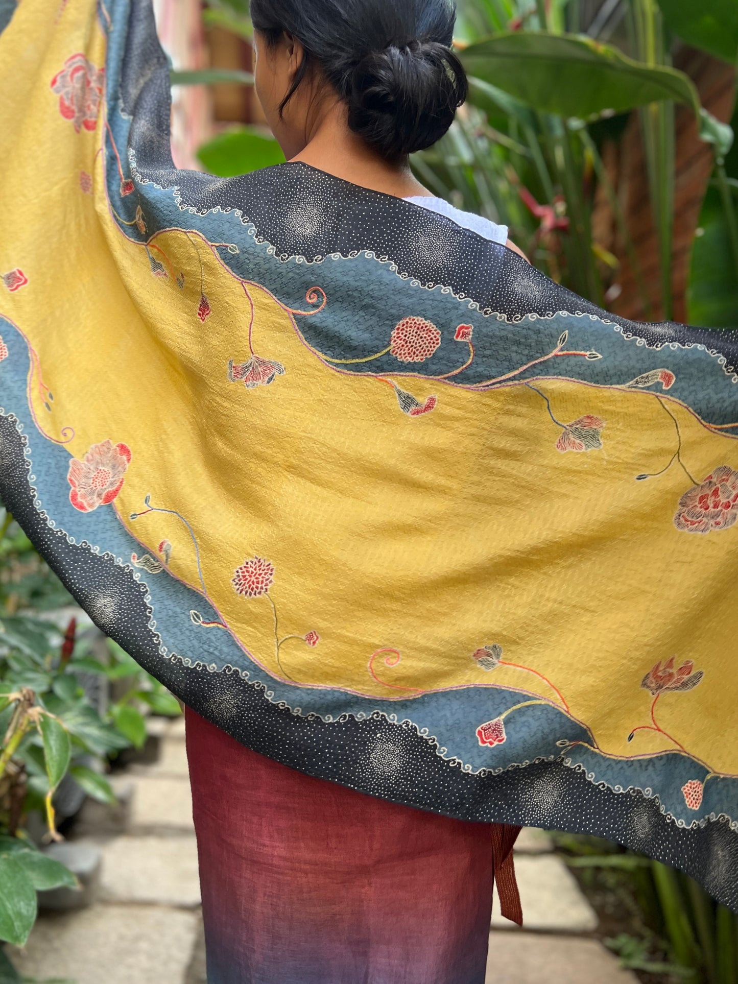 Hand wash gently in cold water with mild soap. After rinsing, let the garment breathe in the shade—keep it away from harsh sunlight, which may fade its natural beauty. In the beginning, wash separately, as the colors may softly run, like a memory letting go.