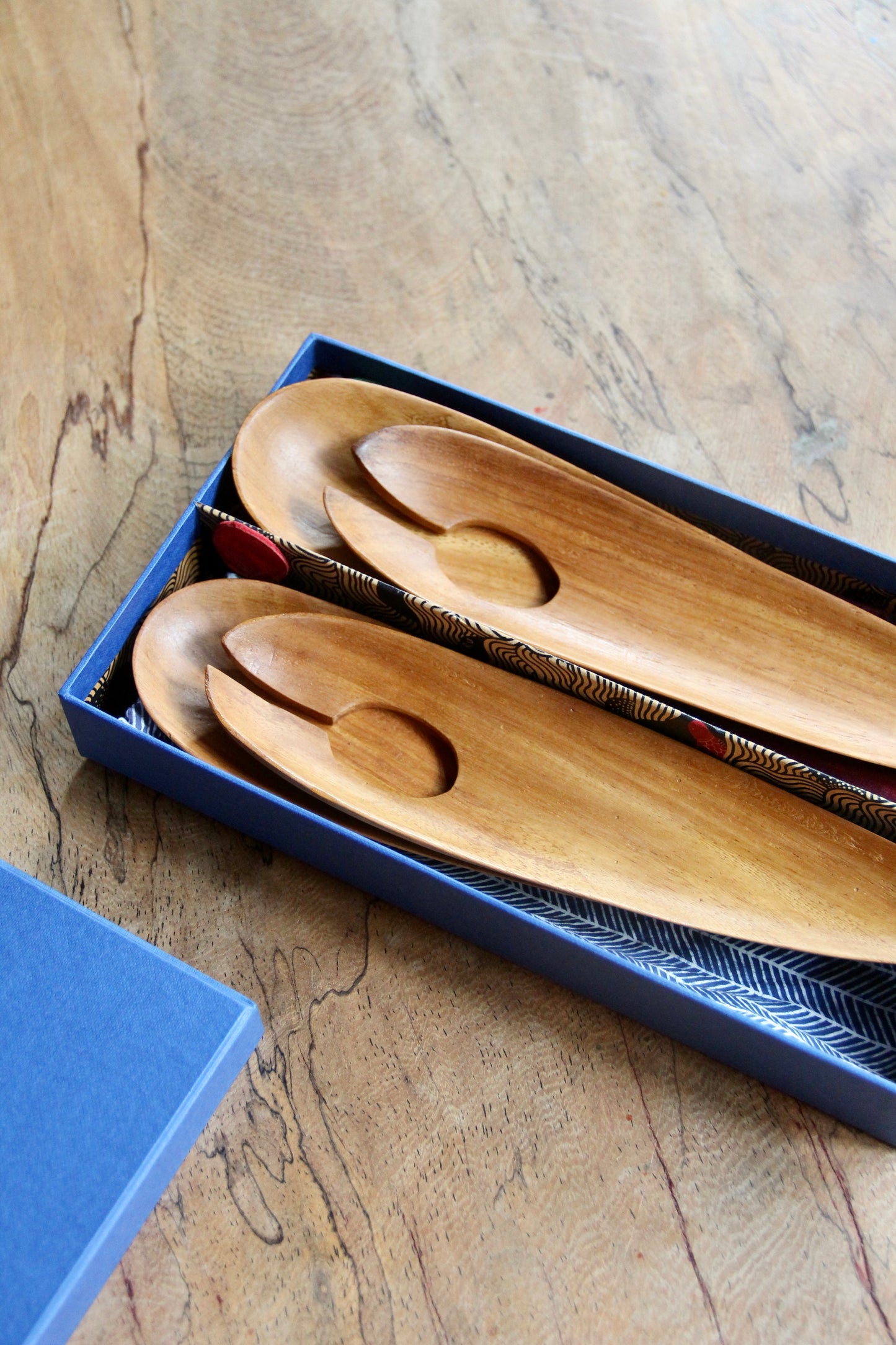 Birubeeru’s wooden tableware is coated in natural shellac, a finish that may soften with time and use. To bring back its gentle shine, simply rub the surface with a soft cloth and a touch of olive oil, coconut oil, or candlenut oil. Rinse with care and dry right away. Like all things shaped by hand, it does not like to be soaked—keep it dry, and it will age with grace.