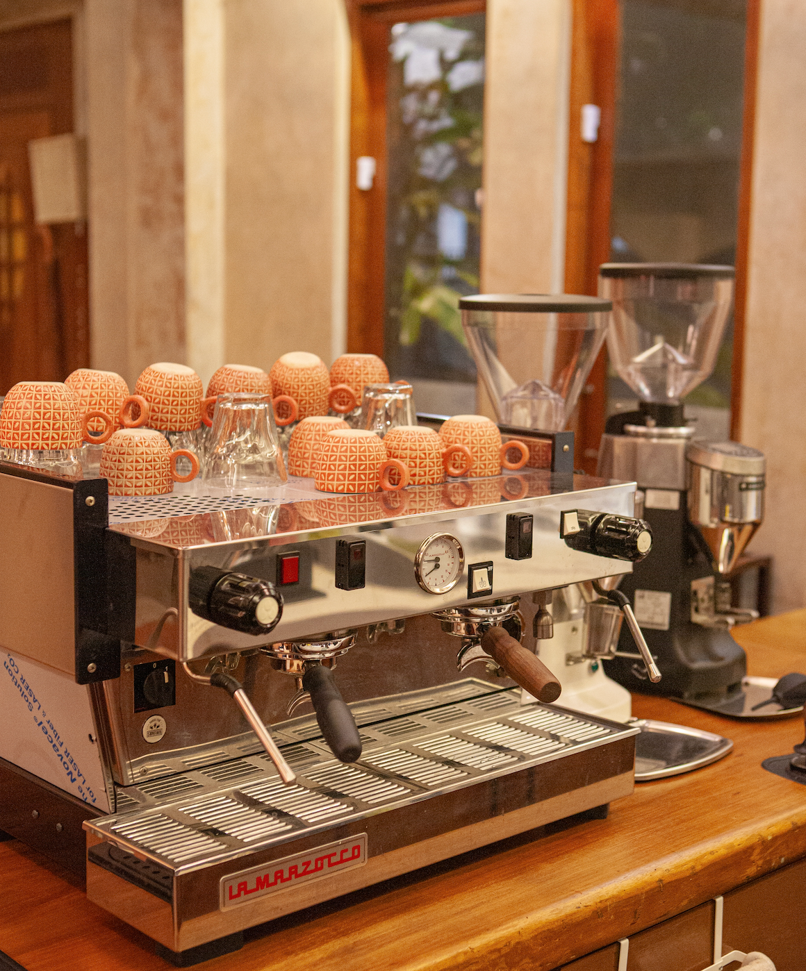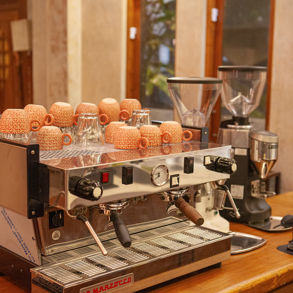Tucked inside our showroom, this intimate space brings together the worlds of craft, comfort, and slow discovery. Here, a cup of coffee becomes part of a larger journey—sipped among hand-woven homeware, textured fabrics, and thoughtfully made clothing.