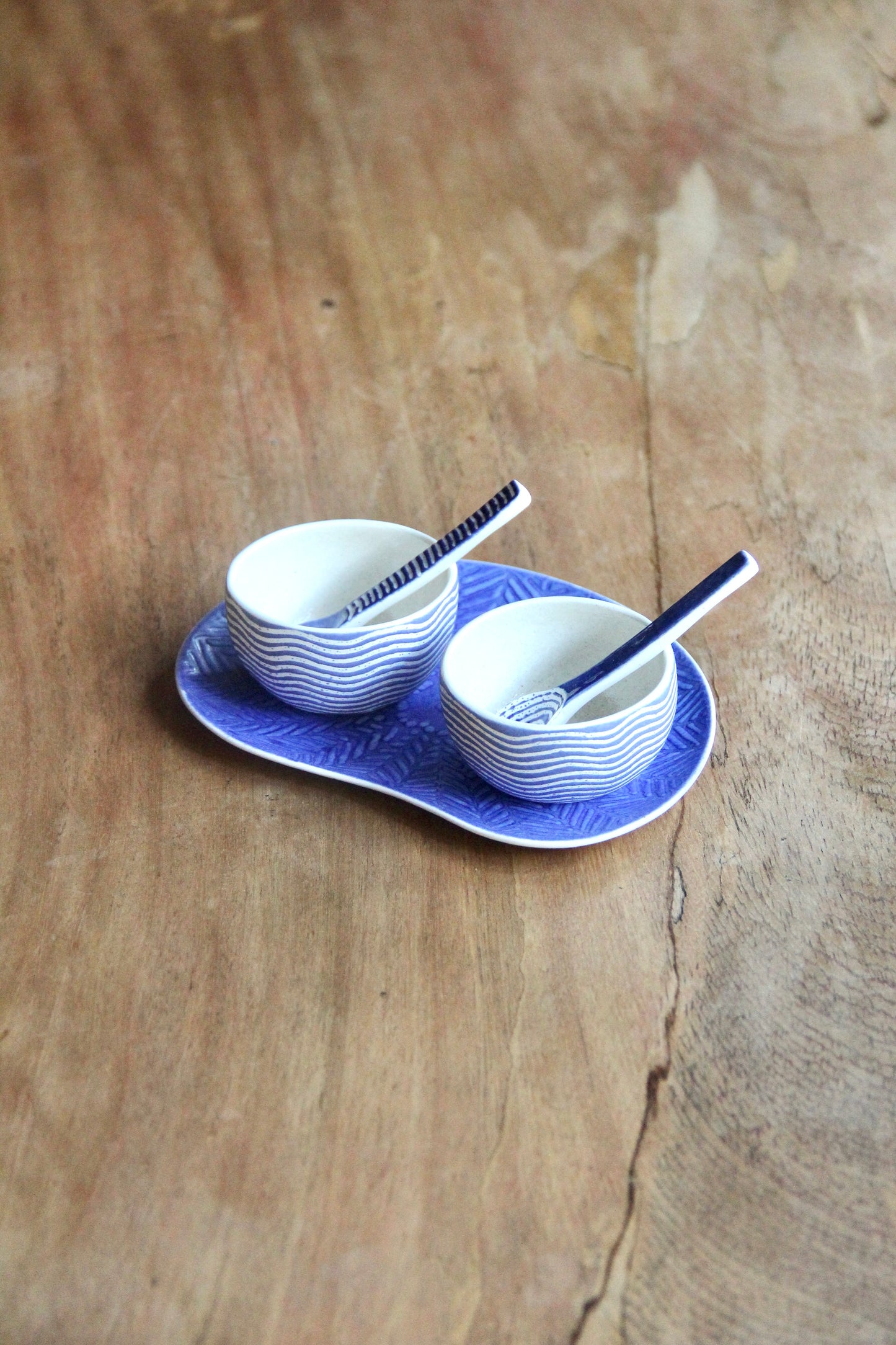 This set comprises 2 condiment bowls, 2 spoons & 1 tray.