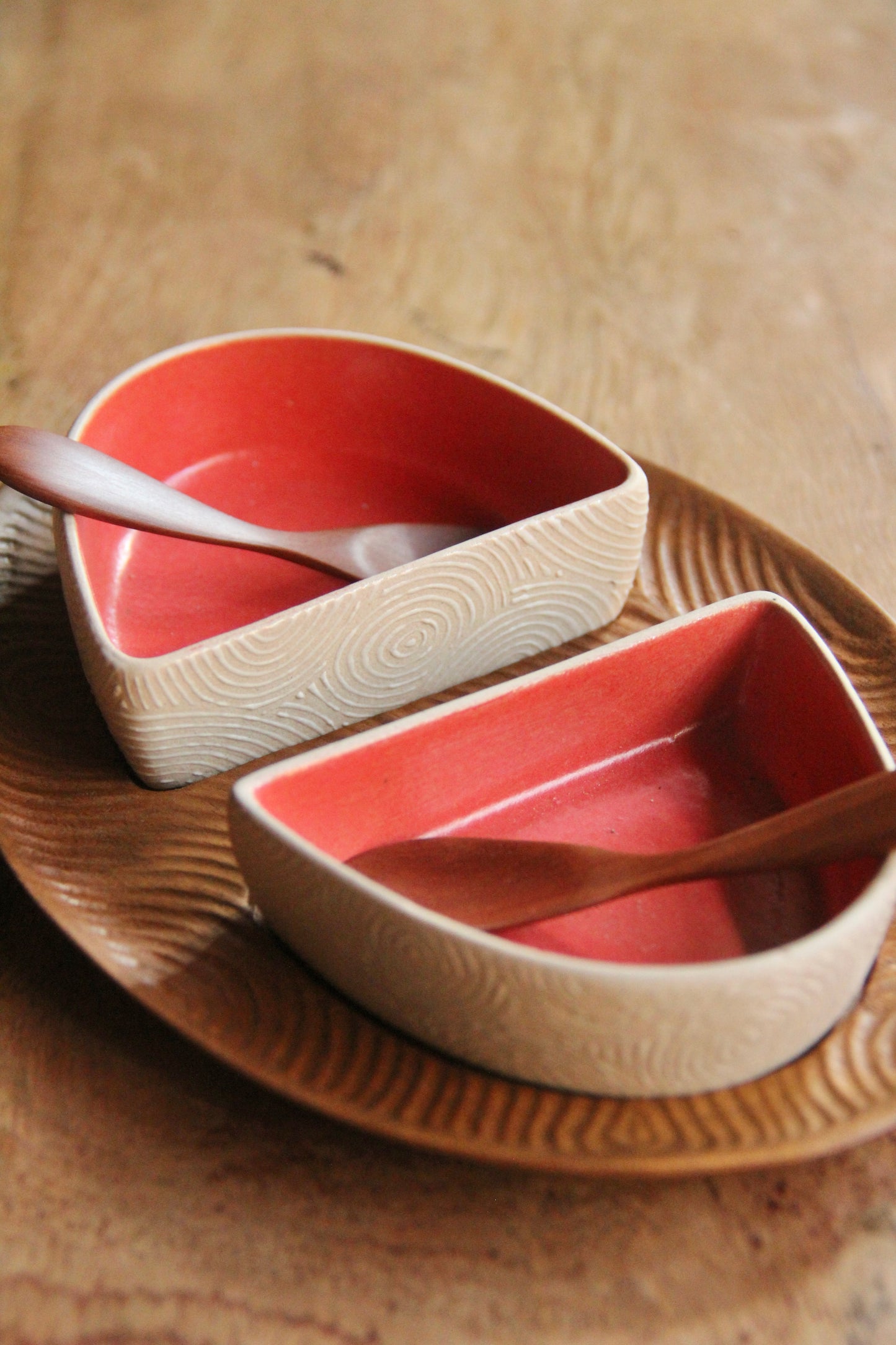 Dimensions: Bowls: L9 x W6.5 cm, H2.5 cm, spoons: L9 x W2 cm, tray: L19.5 x W13.5 cm