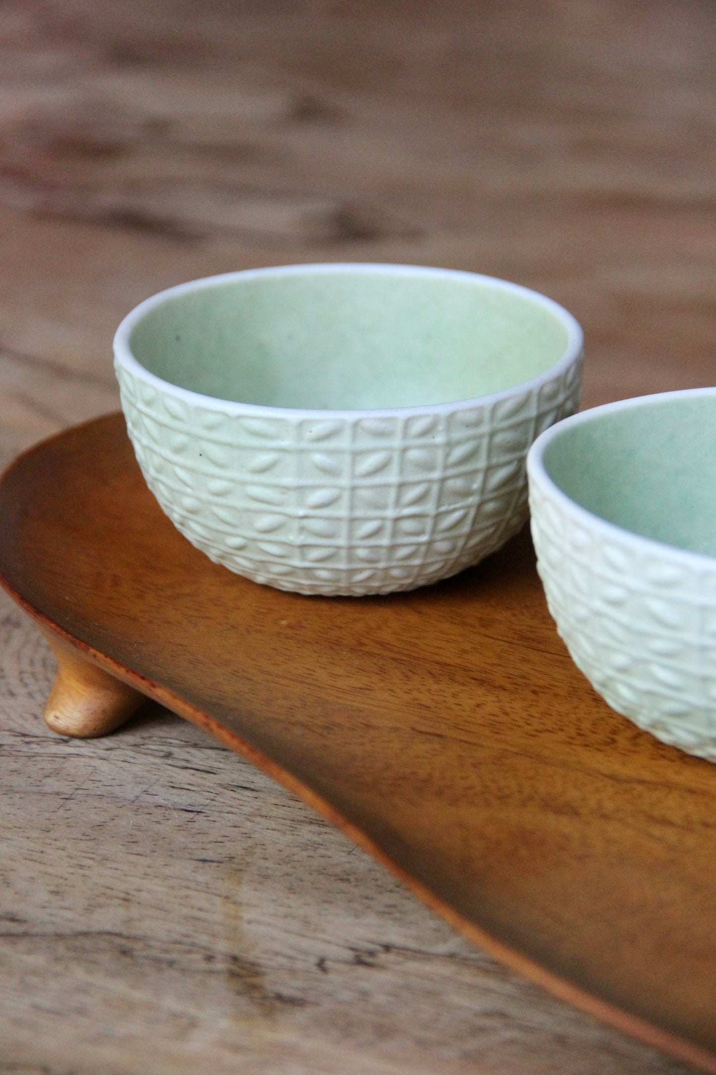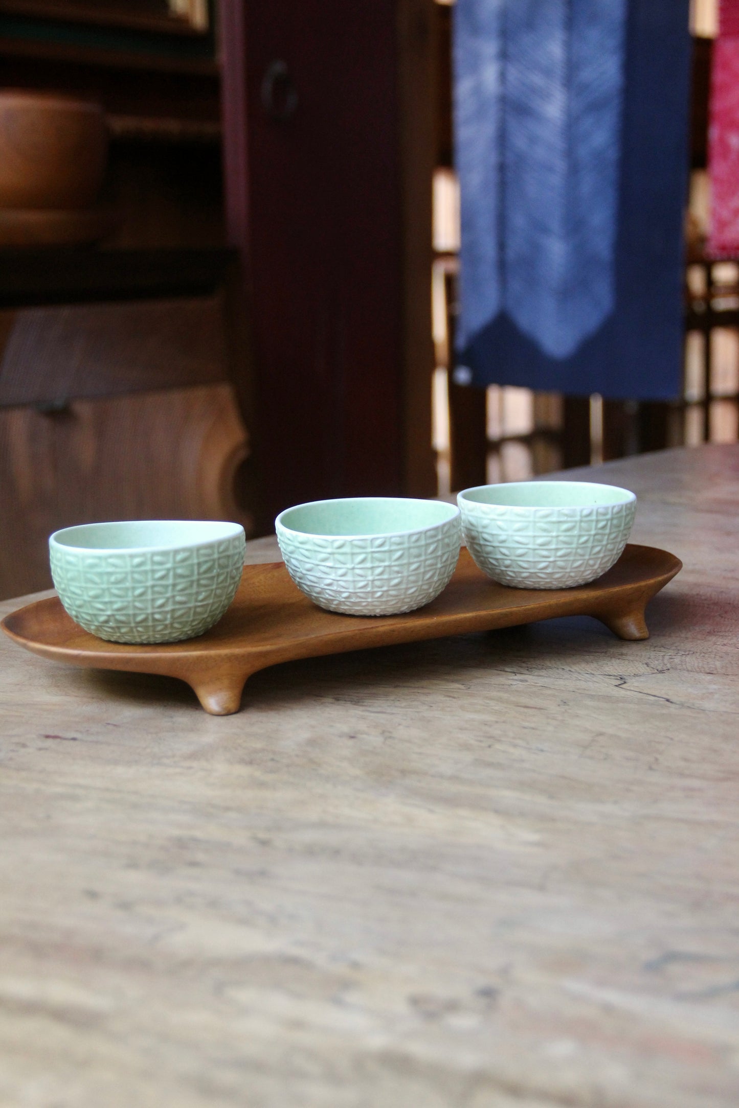 Dimension: Bowls: D8.5 cm, H4.5 cm, tray: L34.5 x W18 cm, H3 cm