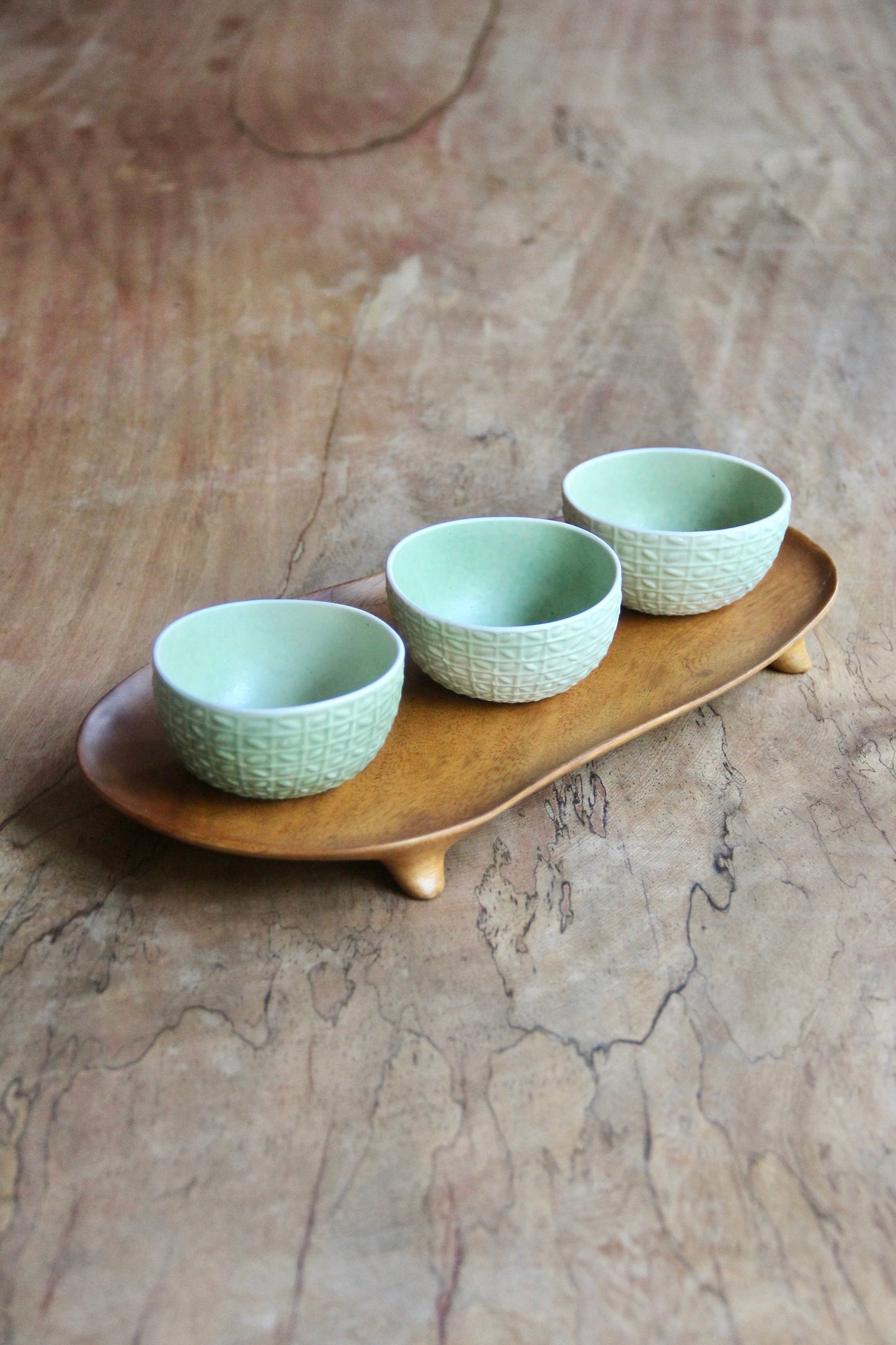 This set comprises 3 serving bowls & 1 Teak 4-legged tray